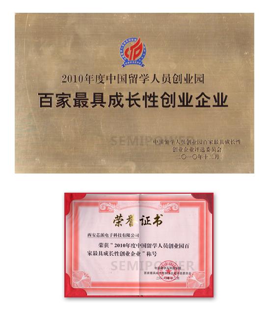 2010年度中國(guó)留學(xué)人員創(chuàng)業(yè)園百家最具成長(zhǎng)性創(chuàng)業(yè)企業(yè)評(píng)審會(huì)議于2010年11月12日至11月13日在北京舉行。來(lái)自留學(xué)人員創(chuàng)業(yè)園、留學(xué)人員回國(guó)服務(wù)機(jī)構(gòu)、風(fēng)險(xiǎn)投資機(jī)構(gòu)、專(zhuān)業(yè)研 究機(jī)構(gòu)、新聞媒體組成的評(píng)審委員會(huì)對(duì)申報(bào)企業(yè)進(jìn)行了初審、復(fù)審和通審,最終確定83家企業(yè)入圍。西安芯派電子科技有限公司入圍,榮獲“2010年度中國(guó)留學(xué)人員創(chuàng)業(yè)園百家最具成長(zhǎng)性創(chuàng)業(yè)企業(yè)”稱號(hào)。