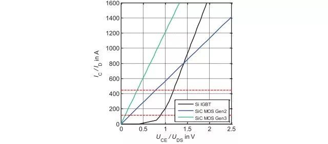由于Si IGBT的導(dǎo)通壓降呈現(xiàn)二極管特性:即使導(dǎo)通電流很小,IGBT也有較大的初始導(dǎo)通壓降。而SiC MOSFET的導(dǎo)通壓降呈現(xiàn)電阻特性:其導(dǎo)通壓降與導(dǎo)通電流成正比。Si IGBT和SiC MOSFET兩種不同的導(dǎo)通壓降特性決定了只有在電流非常大時(shí),SiC MOSFET的導(dǎo)通損耗才會(huì)比Si IGBT高,而在大部分電流區(qū)間,SiC MOSFET的導(dǎo)通損耗要優(yōu)于Si IGBT。在整車工況中,大部分均為小電流工況,而大扭矩工況在整車路譜中的占比很小。而隨著SiC芯片技術(shù)的發(fā)展,未來SiC MOSFET的導(dǎo)通阻抗將全面優(yōu)于Si IGBT。