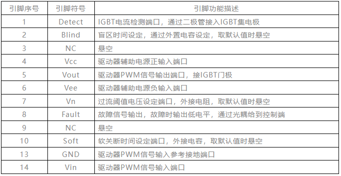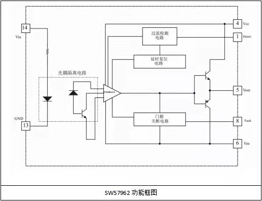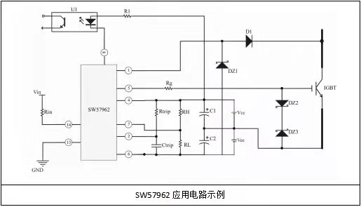 從SW57962的內(nèi)部原理功能框圖可以看出SW57962主要功能塊由四部分組成,分別是光耦隔離電路、過流檢測(cè)電路、門極關(guān)斷電路、延遲復(fù)位電路等單元組成。光耦隔離電路主要用于驅(qū)動(dòng)信號(hào)的電氣隔離及信號(hào)傳輸?shù)淖饔?;過流檢測(cè)電路用于IGBT過流信號(hào)的檢測(cè),具體閾值可進(jìn)行外部調(diào)節(jié);門級(jí)關(guān)斷電路主要作用為異常條件下對(duì)IGBT驅(qū)動(dòng)進(jìn)行關(guān)斷,同時(shí)將該異常信號(hào)輸出反饋至控制級(jí);延遲復(fù)位電路主要用于故障信號(hào)去除后進(jìn)行延遲復(fù)位,使得驅(qū)動(dòng)信號(hào)恢復(fù)正常,達(dá)到軟開啟的效果。